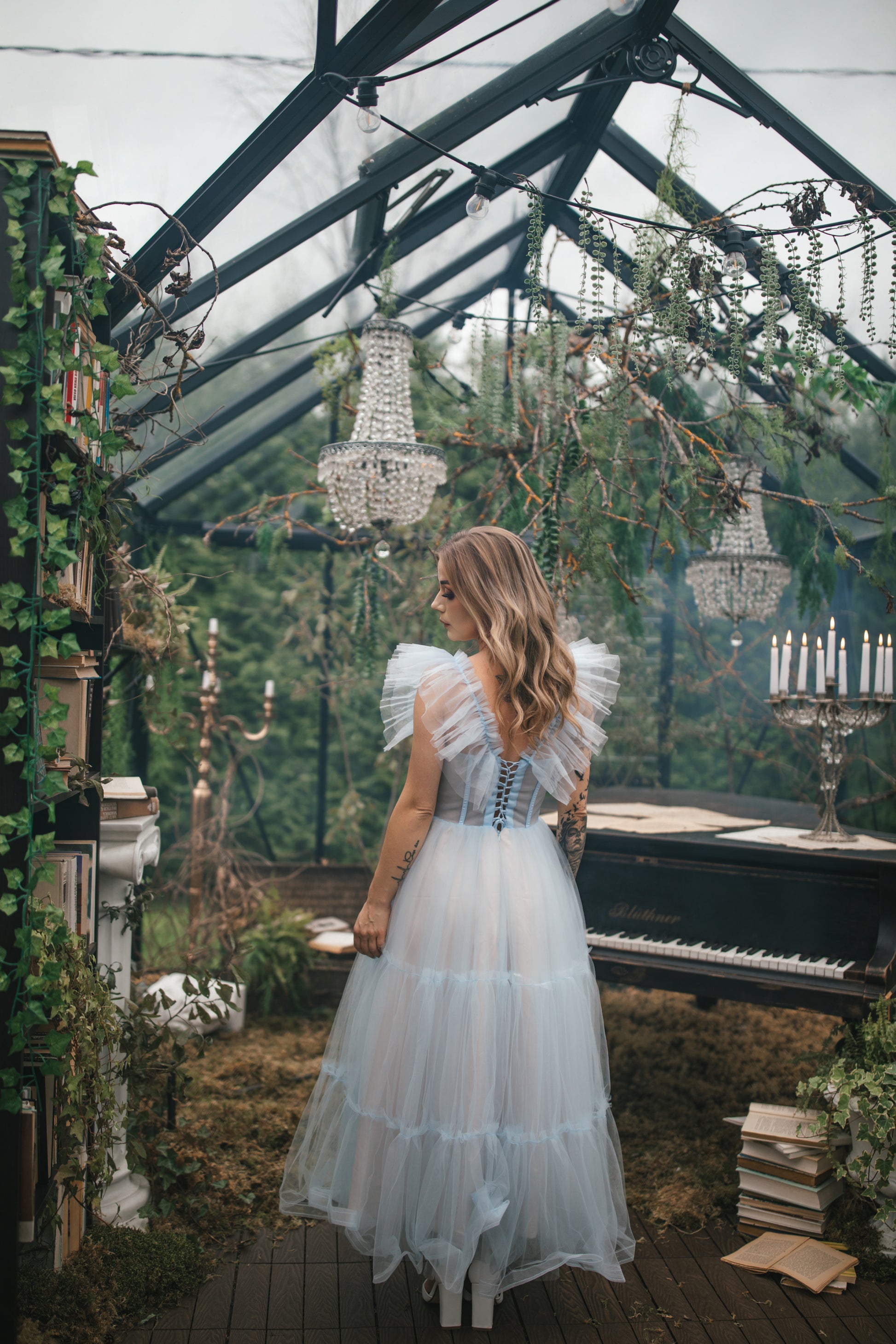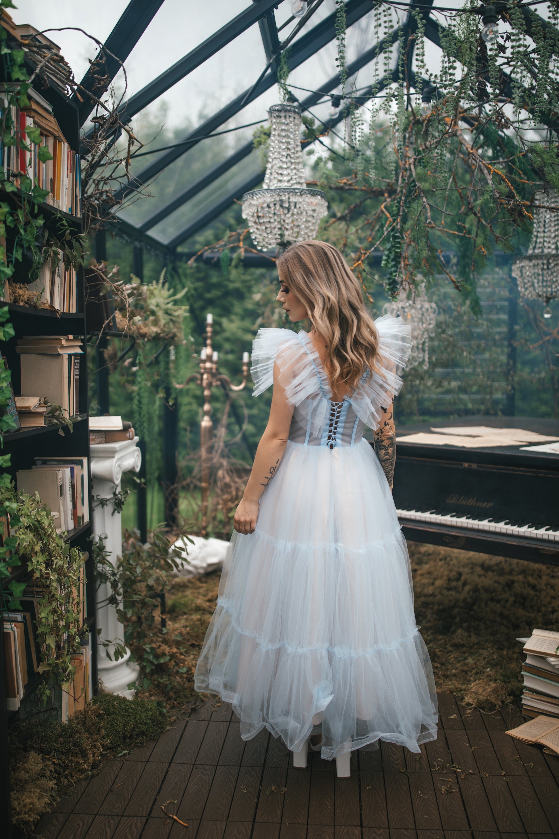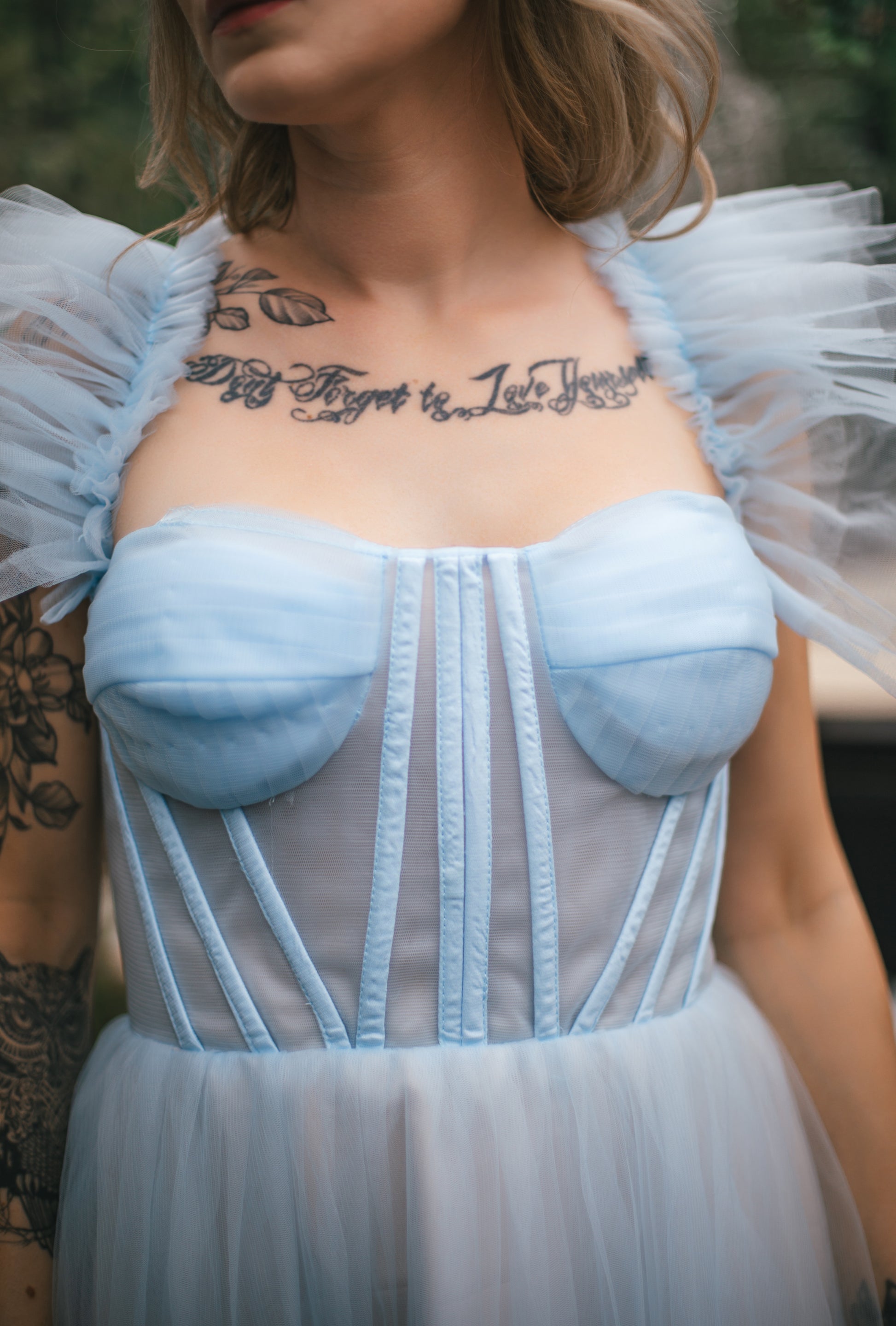 This baby blue midi dress charms with soft ruffled tulle on the shoulders, creating a playful and romantic look. The corset back adds a magical, fairy-tale princess feel, perfect for weddings, proms, or enchanting photo sessions. Its stunning design blends cuteness with elegance, making every moment feel like a dream come true.