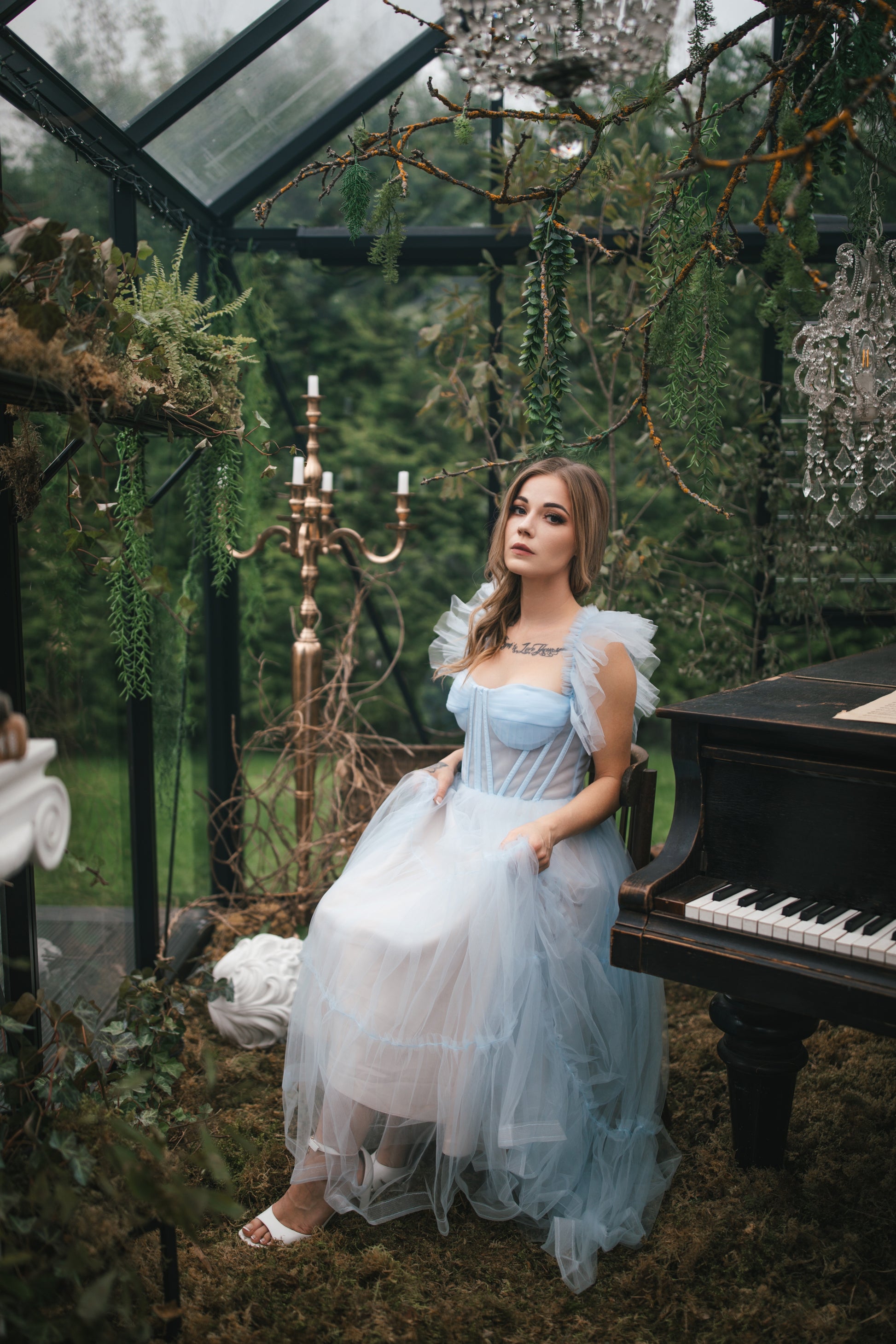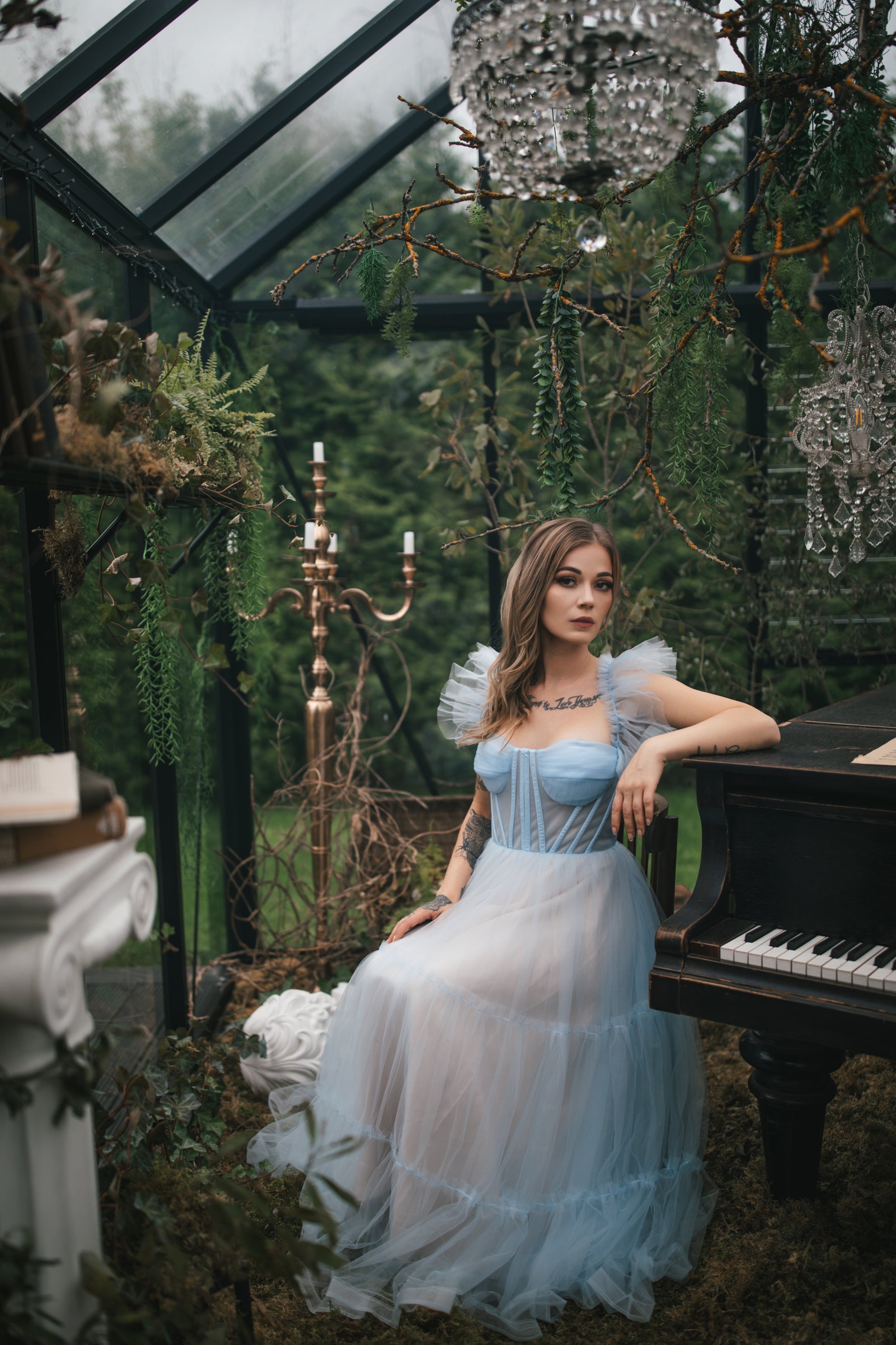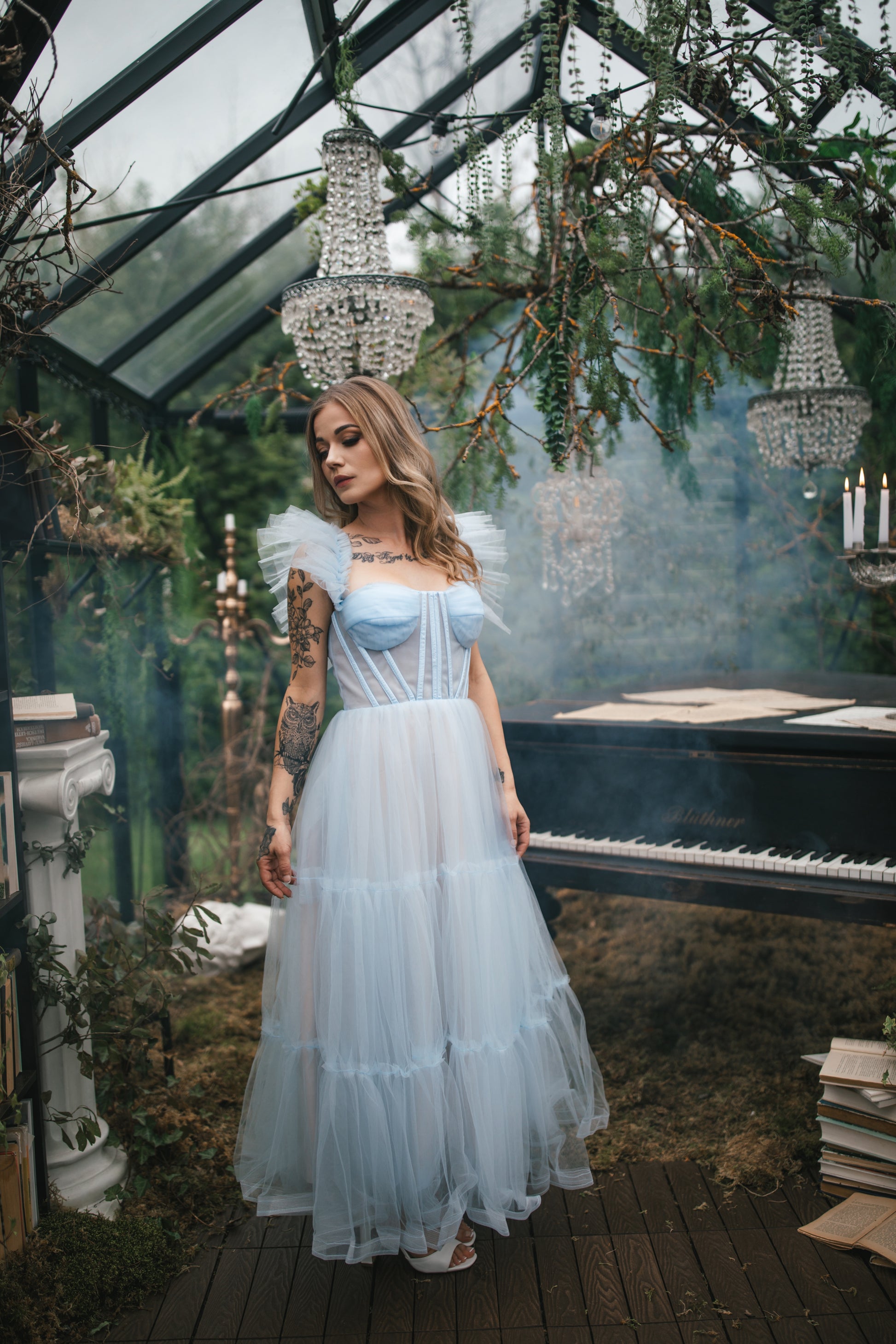 This baby blue midi dress charms with soft ruffled tulle on the shoulders, creating a playful and romantic look. The corset back adds a magical, fairy-tale princess feel, perfect for weddings, proms, or enchanting photo sessions. Its stunning design blends cuteness with elegance, making every moment feel like a dream come true.