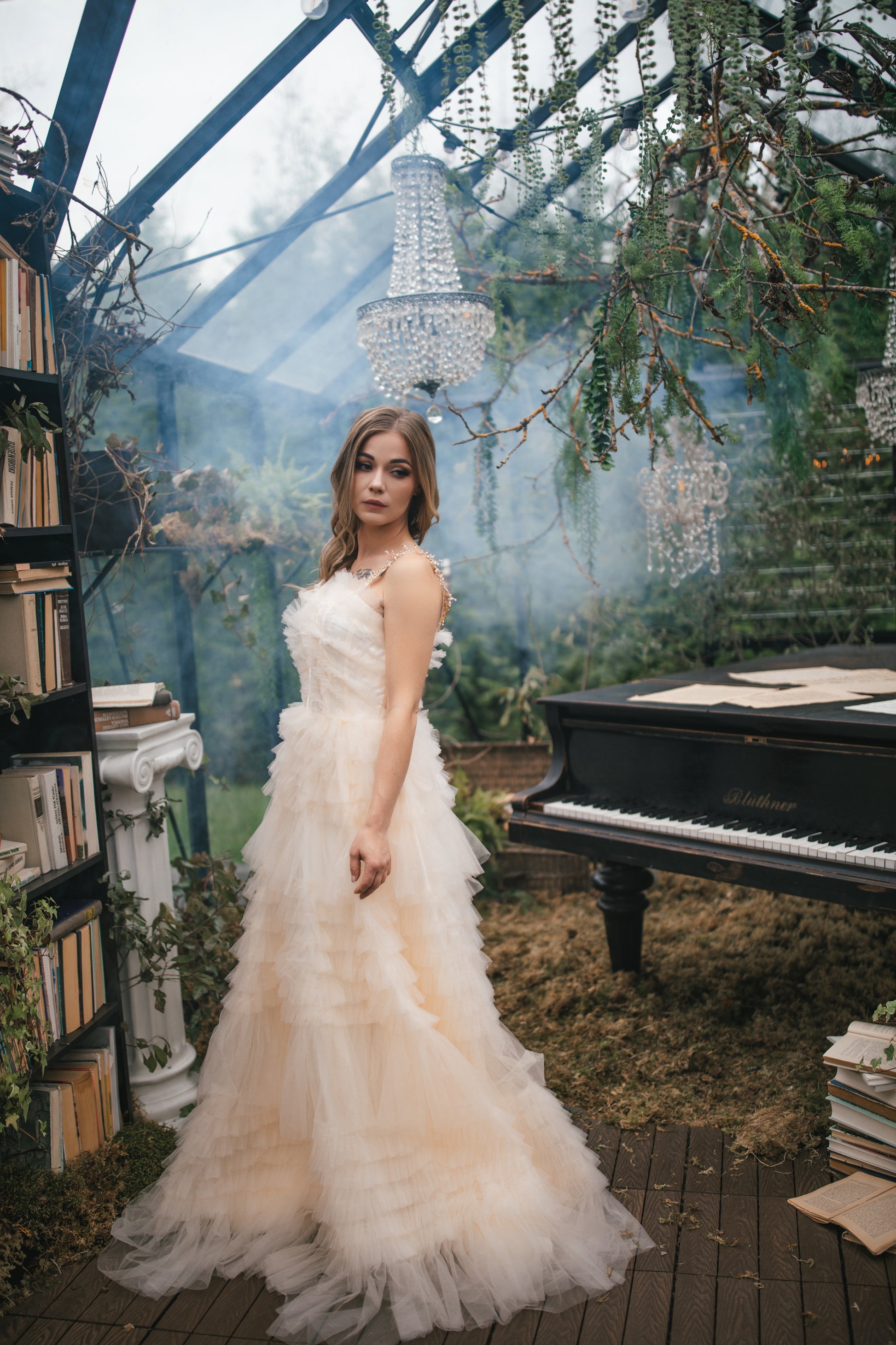 Step into a fairytale in this champagne-colored gown, where voluminous ruffles and soft tulle create a dreamy princess silhouette. The floor-length design flows gracefully, while a delicate corset back adds a touch of romance. Sparkling pearls and diamonds adorn the shoulder straps, perfect for turning heads at weddings, proms, or photo sessions. Let this enchanting dress sweep you into the spotlight with playful elegance.